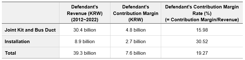 In addition, since the defendant's product includes components other than the two patented components, the IP High Court determined that the plaintiff's patents contributed 20% to the value of the joint kit, bus duct, and installation services with each patent contributing 10%. Accordingly, the IP High Court assessed damages based on 20% of the total contribution margin (KRW 7.6 billion), awarding KRW 1.5 billion to the plaintiff.