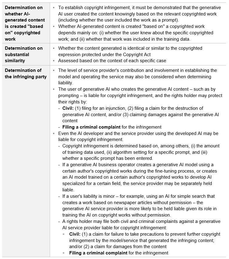The Copyright Dispute Prevention Guidelines provide more specific standards for determining (i) copyright infringement of generative AI outputs in the service (generation) phase and (ii) the infringing party (i.e., liabilities), although they do not cover issues arising during the generative AI training phase.