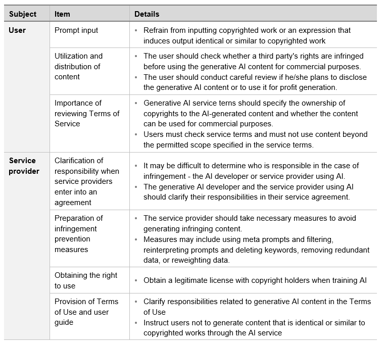 - AI service providers are advised to filters so as not to produce AI-generated outputs that are identical or similar to copyrighted works.