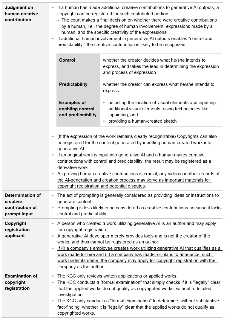 The Copyright Registration Guidelines classify (i) generative AI content for which human creative contribution is recognized and can be registered as "work utilizing generative AI," and (ii) those that are not as "generative AI outputs." The Copyright Registration Guidelines also provide key examples of works utilizing generative AI and copyright registration cases: