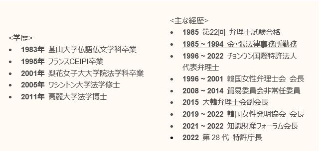 なお、韓国の特許庁長は「次官級」政務職公務員の地位を有しており、公式的な任期は2年である。