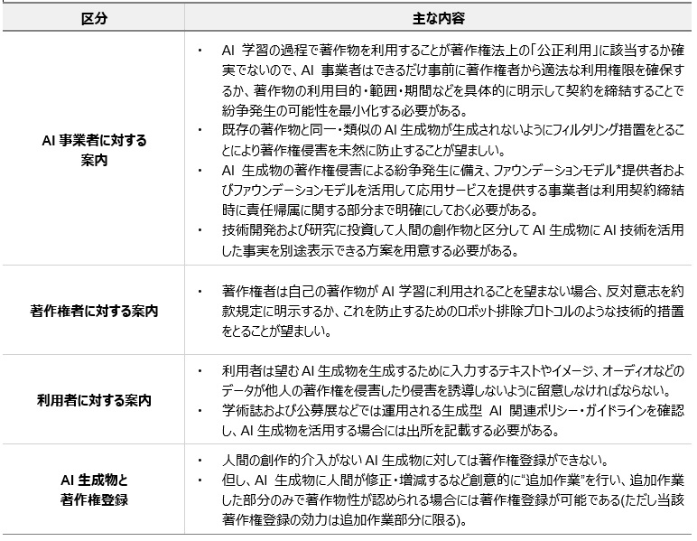 このガイドには法的拘束力はないものの、生成型AI実現のためのモデル構築からAI生成物の生成にかけての一連の過程で発生しうる各種著作権関連イシューについて、AI事業者、著作権者、AI利用者など多様な利害関係者に有用な政策方向を提示している。
